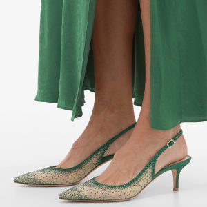 Green Vegan Suede & Mesh Rhinestone Slingback Pumps with Kitten Heel