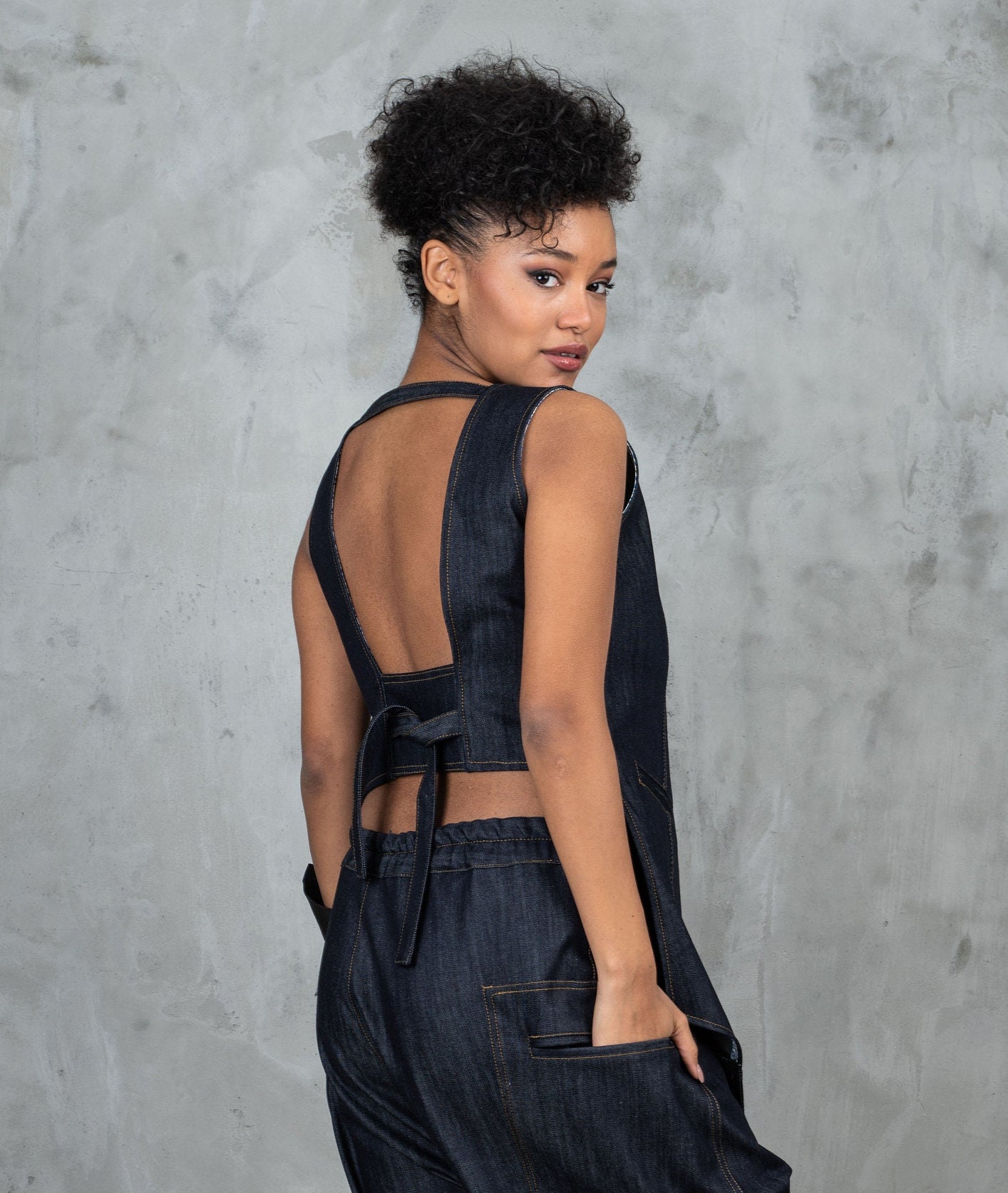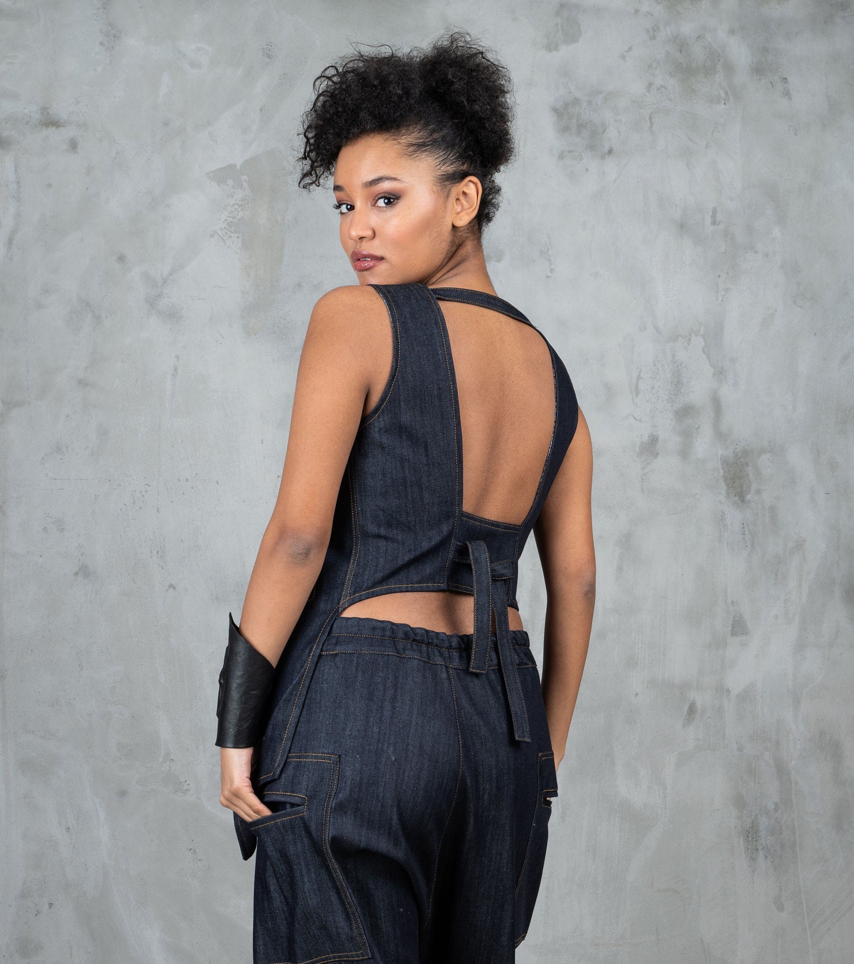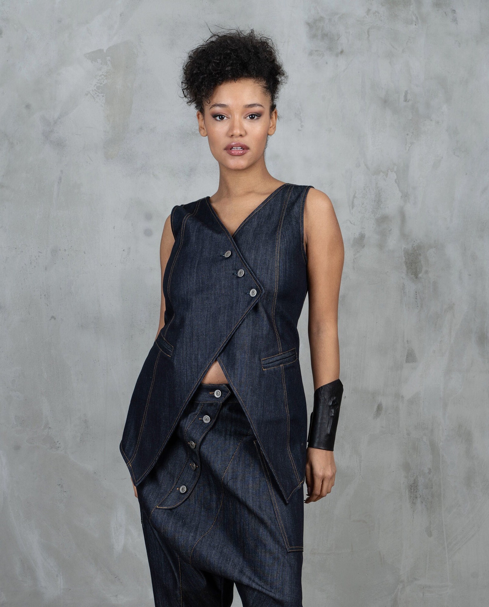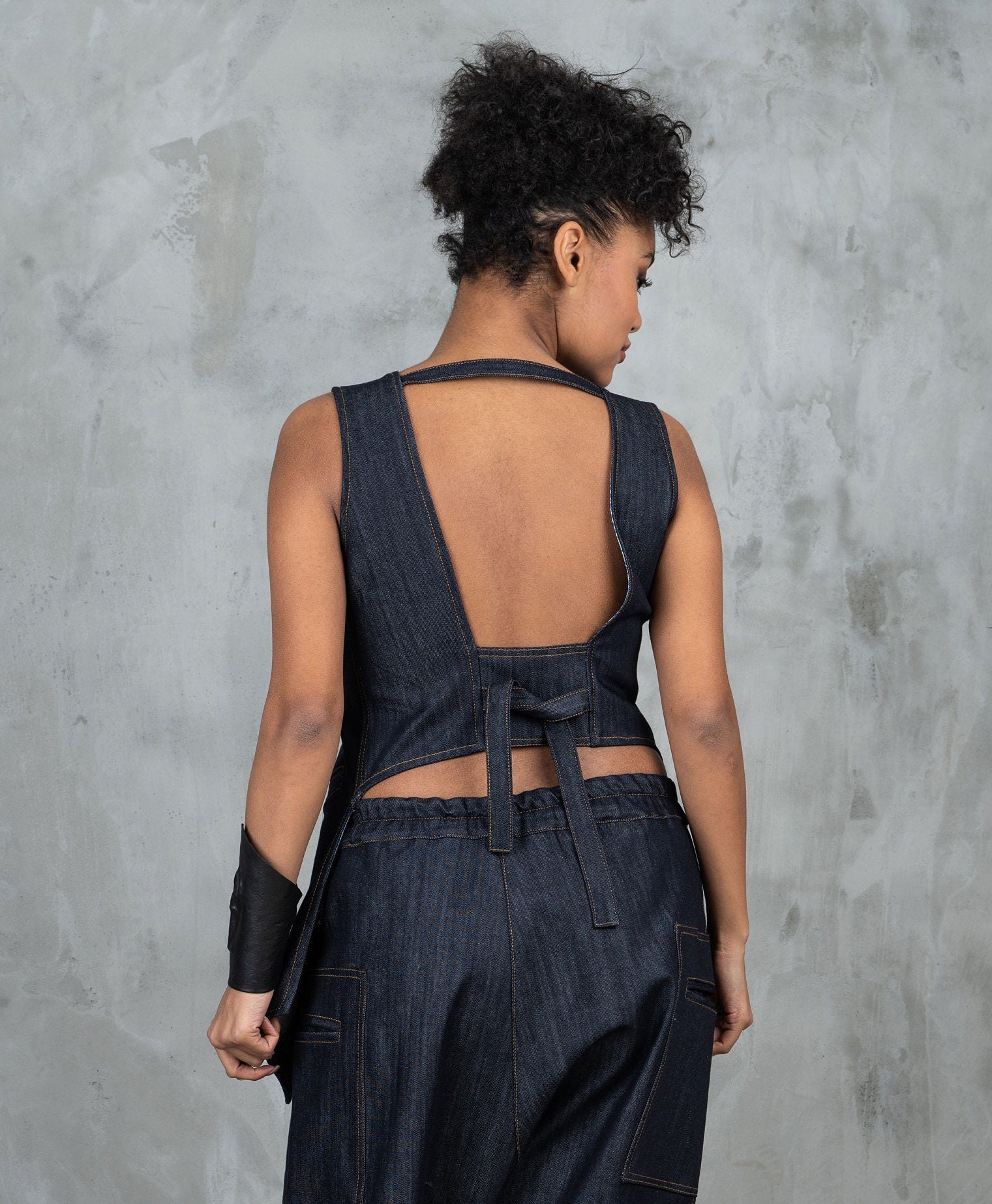 Inspire them all in the Blue denim waistcoat women avant garde clothing. This cotton clothing features an asymmetrical construction with an avant garde bare back.
