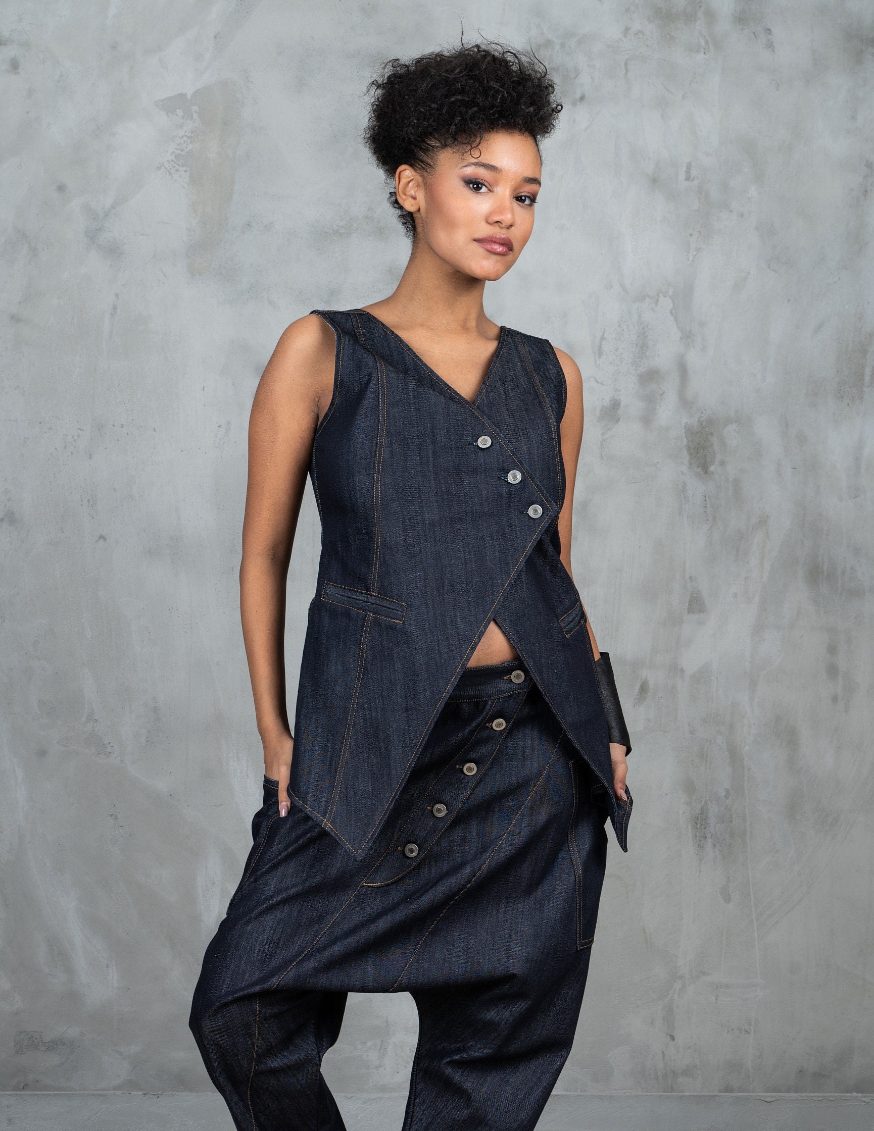 The Blue denim waistcoat women avant garde clothing is designed to be comfortable and not troublesome to wear.