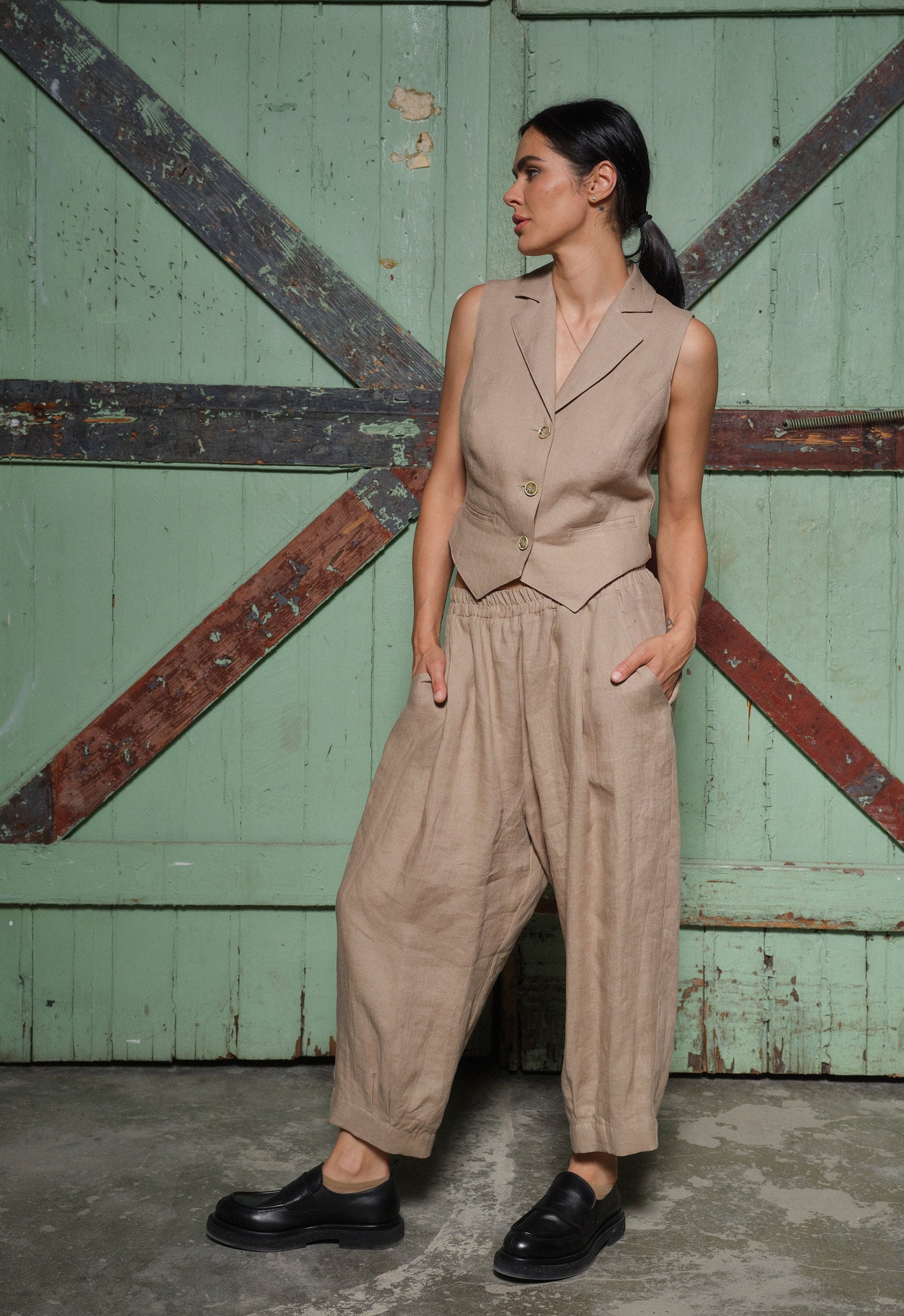 Introducing our Tailored Beige Linen Vest for Women – the epitome of effortless elegance and a must-have addition to your summer wardrobe. Handcrafted with the utmost care and attention to detail, this vest is more than just a piece of clothing; it’s a statement of quality, style, and sustainability.