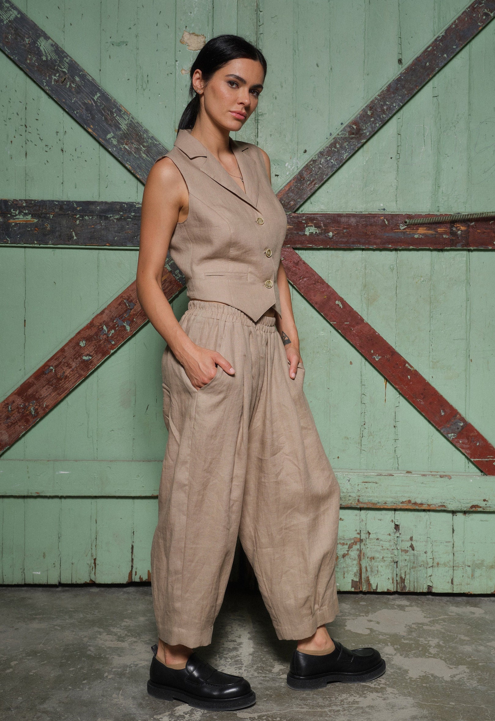 Pair this linen vest with our matching balloon silhouette linen pants to create an enchanting summer suit that exudes sophistication and charm. With sizes ranging from XS to 6XL, finding the perfect fit has never been easier. And for those who prefer a truly customized experience, we’re happy to tailor this vest to your personal measurements.